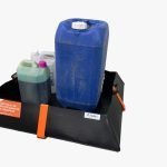 Com capacidade de retenção de 38 litros, o equipamento é indicado para contenção de eventuais vazamentos provenientes de galões, frascos ou recipientes de pequeno porte.